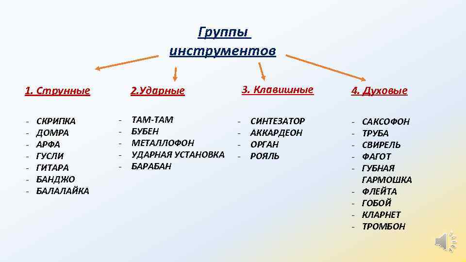 Группы инструментов - СКРИПКА ДОМРА АРФА ГУСЛИ ГИТАРА БАНДЖО БАЛАЛАЙКА 3. Клавишные 2. Ударные 1. Струнные - ТАМ-ТАМ БУБЕН МЕТАЛЛОФОН УДАРНАЯ УСТАНОВКА БАРАБАН - СИНТЕЗАТОР АККАРДЕОН ОРГАН РОЯЛЬ 4. Духовые - САКСОФОН ТРУБА СВИРЕЛЬ ФАГОТ ГУБНАЯ ГАРМОШКА ФЛЕЙТА ГОБОЙ КЛАРНЕТ ТРОМБОН