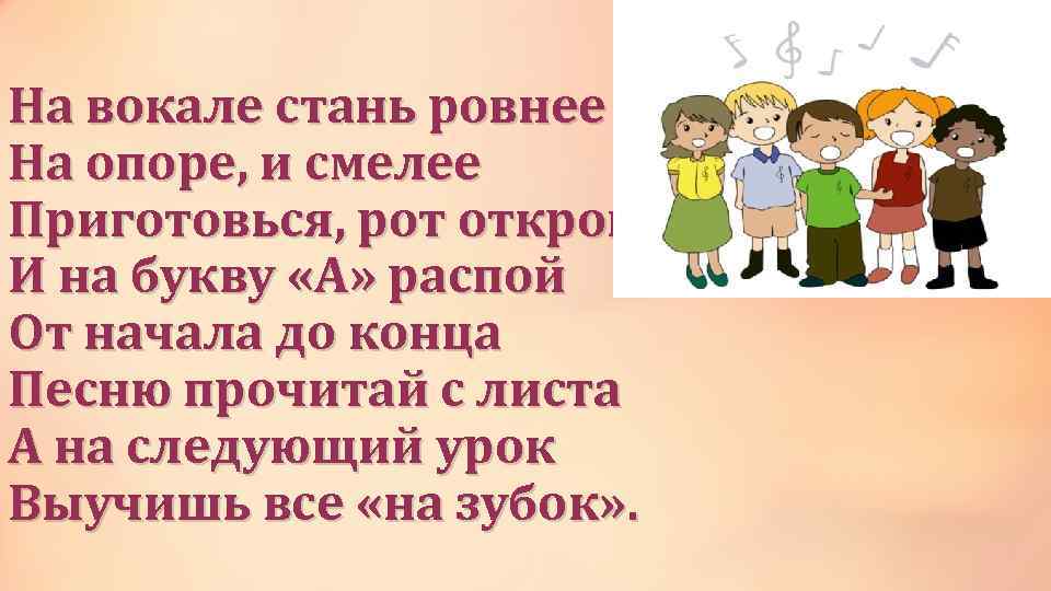 На вокале стань ровнее На опоре, и смелее Приготовься, рот открой И на букву «А» распой От начала до конца Песню прочитай с листа А на следующий урок Выучишь все «на зубок» .