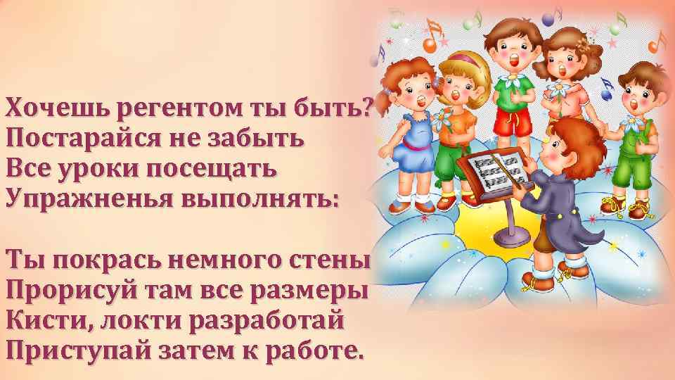 Хочешь регентом ты быть? Постарайся не забыть Все уроки посещать Упражненья выполнять: Ты покрась немного стены Прорисуй там все размеры Кисти, локти разработай Приступай затем к работе.
