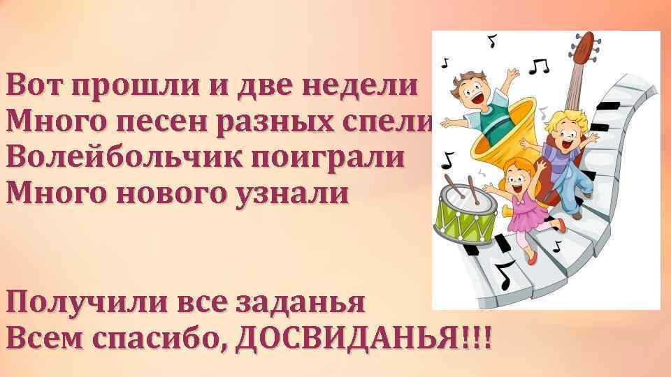 Вот прошли и две недели Много песен разных спели Волейбольчик поиграли Много нового узнали Получили все заданья Всем спасибо, ДОСВИДАНЬЯ!!!