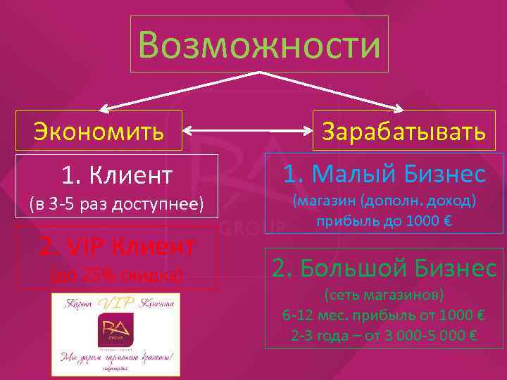 Возможности Экономить Зарабатывать 1. Клиент 1. Малый Бизнес (в 3 -5 раз доступнее) 2. VIP Клиент (до 25% скидка) (магазин (дополн. доход) прибыль до 1000 € 2. Большой Бизнес (сеть магазинов) 6 -12 мес. прибыль от 1000 € 2 -3 года – от 3 000 -5 000 €