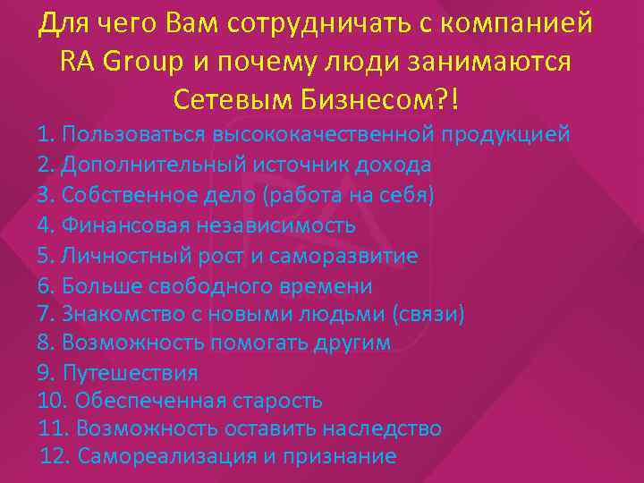 Для чего Вам сотрудничать с компанией RA Group и почему люди занимаются Сетевым Бизнесом? ! 1. Пользоваться высококачественной продукцией 2. Дополнительный источник дохода 3. Собственное дело (работа на себя) 4. Финансовая независимость 5. Личностный рост и саморазвитие 6. Больше свободного времени 7. Знакомство с новыми людьми (связи) 8. Возможность помогать другим 9. Путешествия 10. Обеспеченная старость 11. Возможность оставить наследство 12. Самореализация и признание