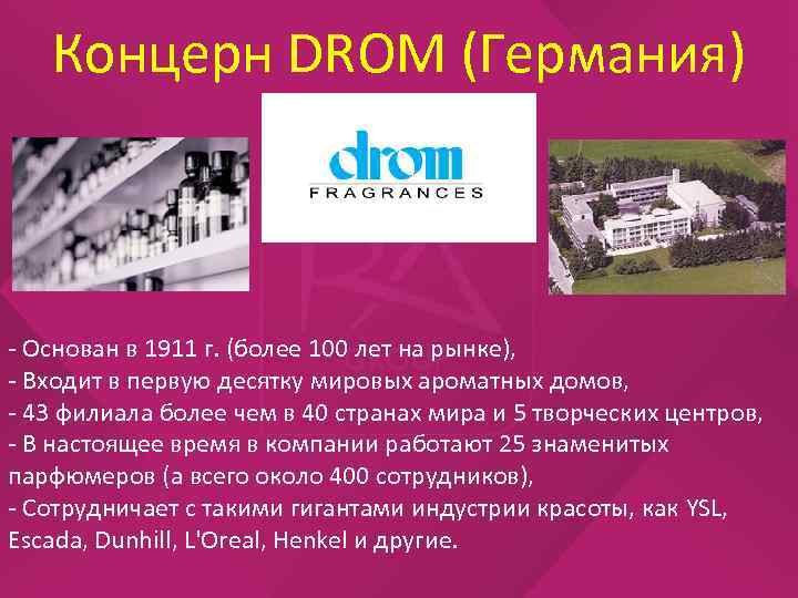 Концерн DROM (Германия) - Основан в 1911 г. (более 100 лет на рынке), - Входит в первую десятку мировых ароматных домов, - 43 филиала более чем в 40 странах мира и 5 творческих центров, - В настоящее время в компании работают 25 знаменитых парфюмеров (а всего около 400 сотрудников), - Сотрудничает с такими гигантами индустрии красоты, как YSL, Escada, Dunhill, L'Oreal, Henkel и другие.