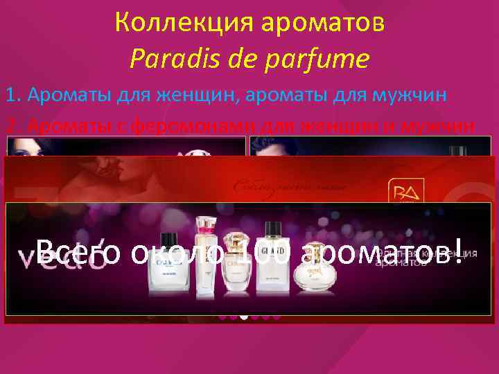 Коллекция ароматов Paradis de parfume 1. Ароматы для женщин, ароматы для мужчин 2. Ароматы с феромонами для женщин и мужчин 3. Элитная серия VEDO Всего около 100 ароматов!