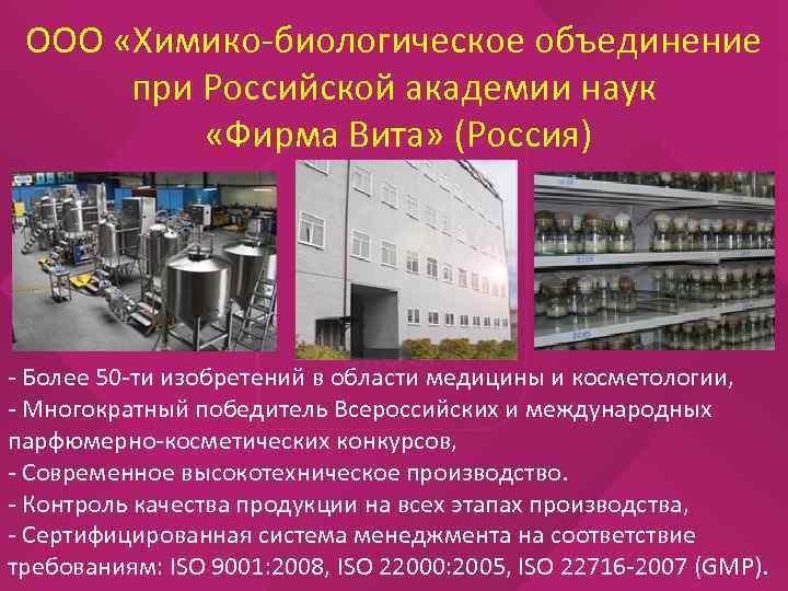 ООО «Химико-биологическое объединение при Российской академии наук «Фирма Вита» (Россия) - Более 50 -ти изобретений в области медицины и косметологии, - Многократный победитель Всероссийских и международных парфюмерно-косметических конкурсов, - Современное высокотехническое производство. - Контроль качества продукции на всех этапах производства, - Сертифицированная система менеджмента на соответствие требованиям: ISO 9001: 2008, ISO 22000: 2005, ISO 22716 -2007 (GMP).