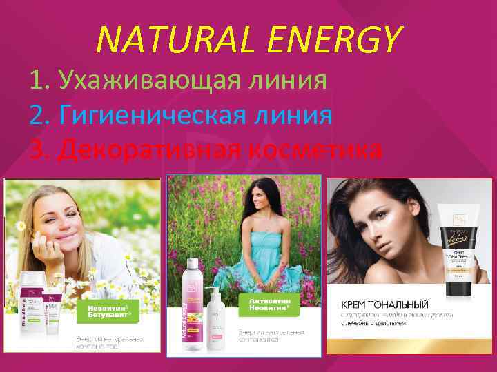 NATURAL ENERGY 1. Ухаживающая линия 2. Гигиеническая линия 3. Декоративная косметика