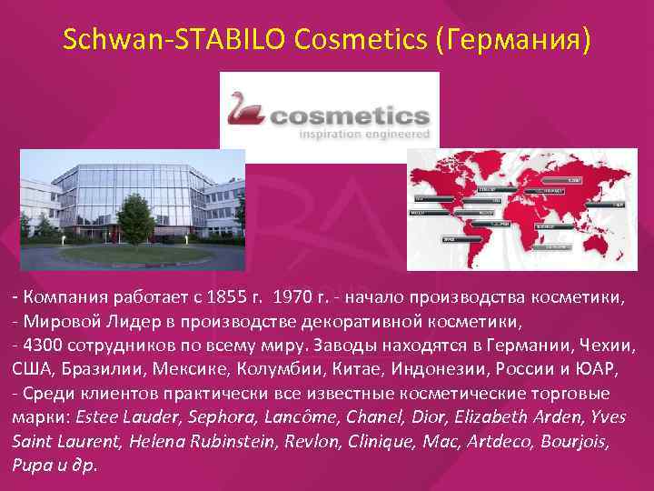 Schwan-STABILO Cosmetics (Германия) - Компания работает с 1855 г. 1970 г. - начало производства косметики, - Мировой Лидер в производстве декоративной косметики, - 4300 сотрудников по всему миру. Заводы находятся в Германии, Чехии, США, Бразилии, Мексике, Колумбии, Китае, Индонезии, России и ЮАР, - Среди клиентов практически все известные косметические торговые марки: Estee Lauder, Sephora, Lancôme, Chanel, Dior, Elizabeth Arden, Yves Saint Laurent, Helena Rubinstein, Revlon, Clinique, Mac, Artdeco, Bourjois, Pupa и др.