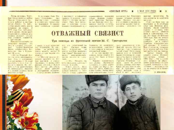 (Из слов М. С. Григорьева) …Мы с напарником , выполняя задание командования, двигались по лесу. Разматывали телефонный провод. Шли осторожно, вдруг услышали чужой говор. На полянку вышли трое в немецкой форме. Мы, не выдавая себя, быстро приготовились к бою и открыли стрельбу. Немецкие солдаты даже не успели понять, откуда стреляют. Среди убитых был офицер. Я взял сумку, которую сдал в штаб. В ней оказались важные документы. За это и получили вторую награду.