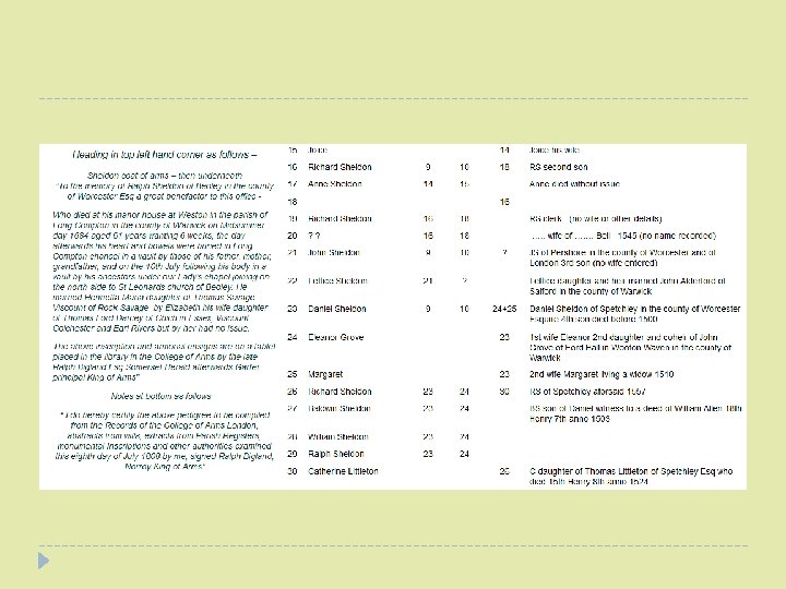 The value of seeing the original sources Bigland Pedigree story Book about the Sheldon’s by Barnard. Now out of print but I photocopied most of it. In it he mentions a full pedigree of the Sheldon’s held by Mrs Warriner of Weston Park. I visited Warwick library and there I saw an entry for the Bigland Pedigree