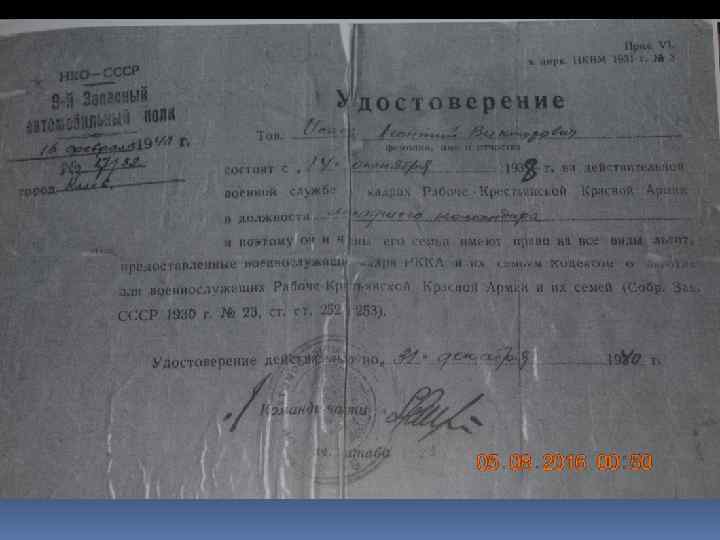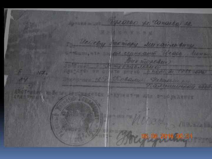 Привет с фронта! Здравствуйте, дорогие родители, шлю вам свой пламенный фронтовой привет, а также сёстрам Клаше, Любе, Лиде и маленькой Валечке, и братишке Гене. Я в настоящее время нахожусь жив, чего и вам желаю, быть всем живыми и здоровыми, дорогие родители. Я знаю. что вы обо мне беспокоитесь, а особенно мама, но я пока ещё жив. 22 июня 1941 года мы принимали бой первыми, я был легко ранен в правую руку осколками бомбы. Но с поля боя не уходил, и в настоящее время себя чувствую отлично и по сей день нахожусь на фронте. Дорогие родители, не обижайтесь, что плохо написал, потому что нет времени-рвутся снаряды и свистят пули. Пишите по старому адресу, возможно, получу. С приветом ваш сын. 30. 06. 1941 г.