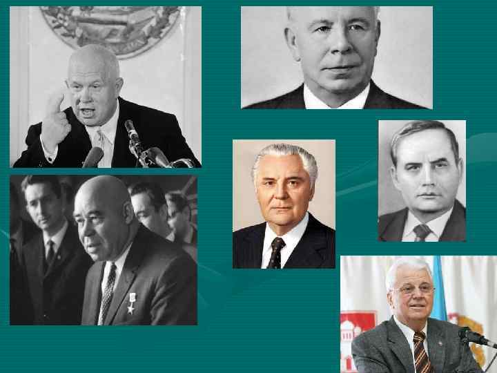 Наши ПЕРВЫЕ генеральные секретари ЦК КП(б)/КП Украины Никита Хрущев январь 1938 — март 1947 Лазарь Каганович март-декабрь 1947 Никита Хрущев декабрь 1947 — декабрь 1949 Леонид Мельников декабрь 1949 — июнь 1953 Алексей Кириченко июнь 1953 — декабрь 1957 Николай Подгорный декабрь 1957 — июль 1963 Петр Шелест июль 1963 — май 1972 Владимир Щербицкий май 1972 — сентябрь 1989 Владимир Ивашко сентябрь 1989 — 23 июня 1990 Станислав Гуренко 23 июня 1990 — сентябрь 1991. Леонид Кравчук октябрь 1989 — 1990