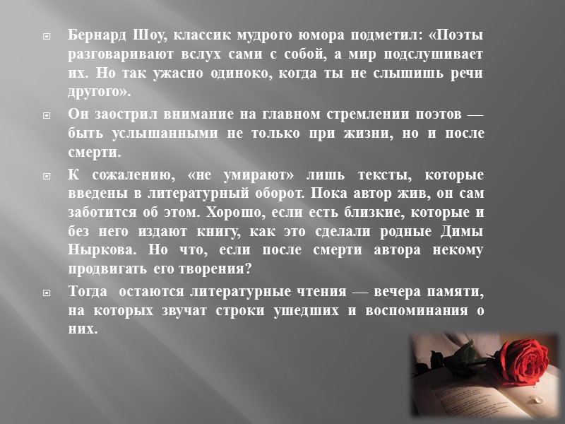 Бернард Шоу, классик мудрого юмора подметил: «Поэты разговаривают вслух сами с собой, а мир подслушивает их. Но так ужасно одиноко, когда ты не слышишь речи другого». Он заострил внимание на главном стремлении поэтов — быть услышанными не только при жизни, но и после смерти. К сожалению, «не умирают» лишь тексты, которые введены в литературный оборот. Пока автор жив, он сам заботится об этом. Хорошо, если есть близкие, которые и без него издают книгу, как это сделали родные Димы Ныркова. Но что, если после смерти автора некому продвигать его творения? Тогда остаются литературные чтения — вечера памяти, на которых звучат строки ушедших и воспоминания о них.