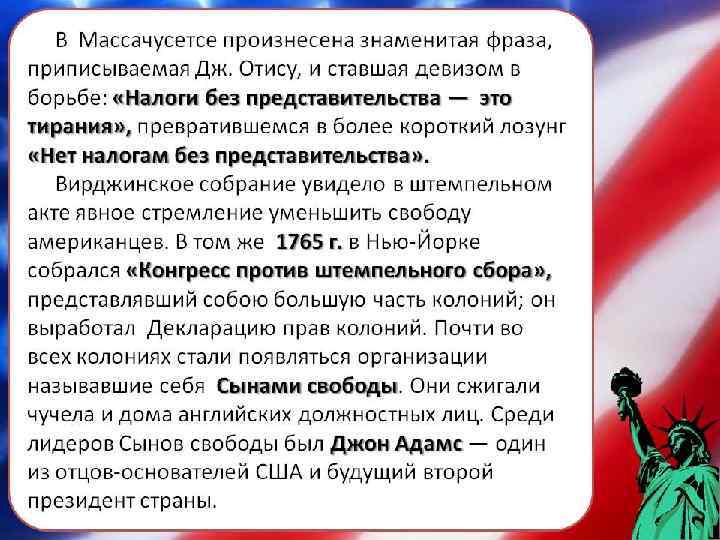 «Суффолкские резолюции» объявили, что неподчинение королю и парламенту обосновывается «законом природы» и теорией общественного договора. «Декларация прав и нужд колоний» от 14 октября 1774 г. говорила о доктрине «никакого налогообложения без представительства» .