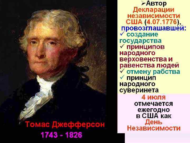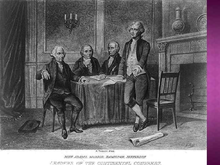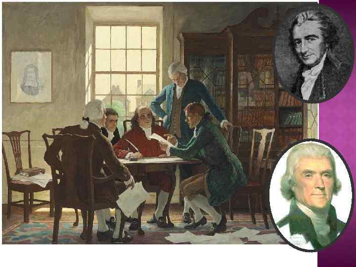 Консультируясь с остальными членами Подготовительного комитета, Томас ДЖЕФФЕРСОН написал первый вариант «Декларации независимости» , используя как образцы, в частности, написанную Джорджем Мейсоном «Декларацию прав человека Виргинии» , собственный проект » Конституции Виргинии» , иные присланные государственными чиновниками и населением проекты. В комитете было ещё четыре члена: Джон АДАМС, Бенджамин ФРАНКЛИН, Роджер ШЕРМАН и Роберт Р. ЛИВИНГСТОН