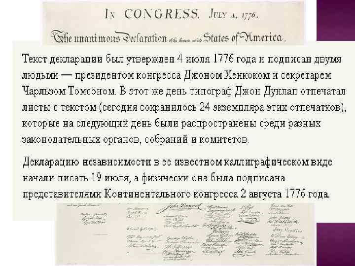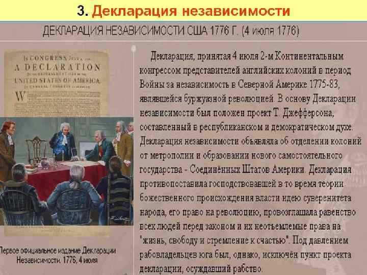 После внесения некоторых изменений, проект был представлен в Конгресс 28 июня 1776 года. 2 июля Конгресс, проголосовав за независимость, стал рассматривать Декларацию. После двухдневных дебатов из Декларации была удалена почти четвертая часть текста, в том числе критика рабства и работорговли, что особенно возмутило Джефферсона, который был противником рабства, несмотря на то, что сам использовал рабский труд на своих плантациях.
