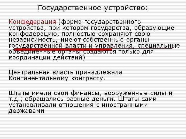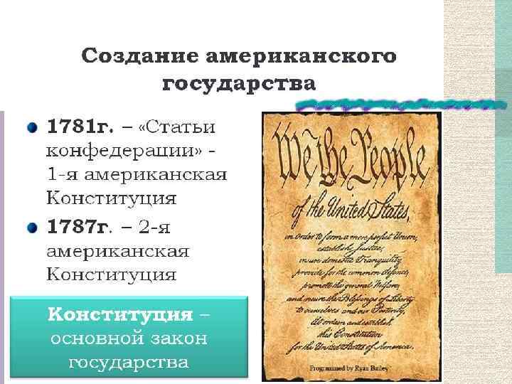 Была выработана первая общеамериканская конституция под названием «Статьи Конфедерации и Вечного Союза» , идея которой впервые была Союза» высказана Б. Франклином еще в июле 1775 г. и одобрена Конгрессом лишь 15 ноября 1777 г. Ратификация этого акта всеми штатами - 1 марта 1781 г.
