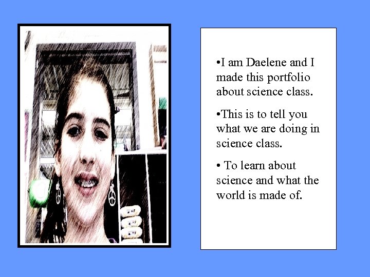 • I am Daelene and I made this portfolio about science class. • This is to tell you what we are doing in science class. • To learn about science and what the world is made of.
