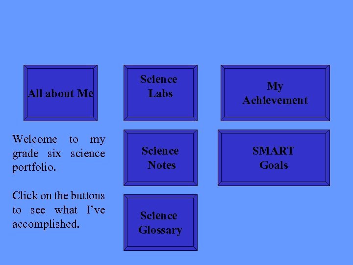 All about Me Science Labs Welcome to my grade six science portfolio. Science Notes Click on the buttons to see what I’ve accomplished. Science Glossary My Achievement SMART Goals