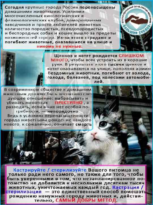 Что именно ВЫ можете сделать, чтобы уменьшить проблему и страдания бездомных животных в вашем городе? ! У вас в подъезде живет кошка? Если большинство жильцов скинется по символической сумме на стерилизацию кошечки, вы не только будете избавлены на будущее от грызунов в вашем подъезде, но и предотвратите дикий рост численности кошачьих (что рано или поздно неминуемо повлечет жестокую самовольную расправу одного из недовольных (запахом, например) жильцов). Лучше избежать возникновения проблемы, чем потом решать, что делать с постоянно рождающимися котятами или как наказать живодеров. Увидев сбитую машиной собаку, не проходите мимо - вызовите ветеринара на место ЧП. По возможности попытайтесь организовать оказание помощи или хотя бы усыпление несчастного животного, если ему уже нельзя помочь - но главное, не проезжайте мимо. Кроме нас, им некому помочь! Подавая «коробочникам» , люди спонсируют убийство тех, кто сидит в этих страшных коробках. Если вы выкупаете животных у перекупщиков из жалости - к сожалению, вы поощряете их и дальше зарабатывать на этом кровавом бизнесе. Постоянная скупка и продажа животных на рынке, постоянный спрос на эти "услуги" – это одна из главных причин нахождения там животных. Что делать, если Вы видите "коробочников" - читайте в нашем Живом Журнале: http: //bolshieserdca. livejournal. com/9195. html Не разводите и не покупайте животных (в том числе и породистых), пока на улицах и в приютах умирают бездомные. Потому что каждое животное, купленное в зоомагазине, на рынке или у заводчиков, означает, что другое бездомное животное в приюте или на улице – умирает, это означает ваш вклад и прибыль для людей, которые порабощают и разводят животных ради денег. Однако выведено будет больше животных, чем тех, кто найдут себе дом, а ненужные животные будут выброшены в приюты, брошены на произвол или убиты, виновные только в том, что для них не оказалось дома. Выберите животное у зоозащитников Вашего города: например, в приютах сети "Лапка друга" или у наших волонтеров на WWW. BOLSHIESERDCA. RU !
