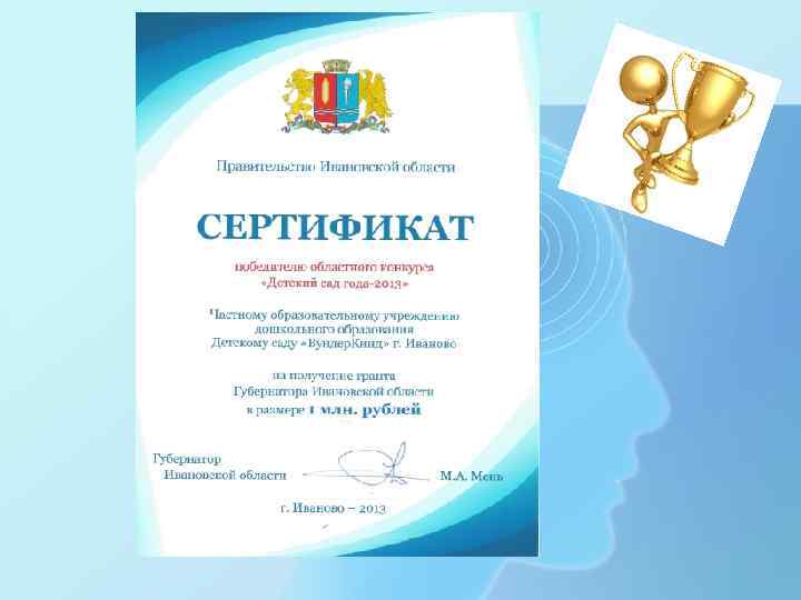 Этапы развития организации 2013 год: - получение первой в городе (и единственной до сих пор) лицензии на дошкольное образование на коммерческой площади (изначально не приспособленной для размещения детей). - Победа в конкурсе «Детский сад года» и получение Гранта Губернатора Ивановской области в размере 1 000 руб - Заключение договора на аренду муниципального помещения для открытия детского сада на 30 мест - Открытие третьего детского развивающего центра «СЁМА» в новом, перспективном районе города. Запуск третьей по счету группы детского са для детей с 1, 2 до 3 лет 2014 год: - Победа в конкурсе социально-ориентированных некоммерческих организаций Расширение существующих групп. Общее количество детей, посещающий детские сады «Вундер. Кинд» - 40 человек.