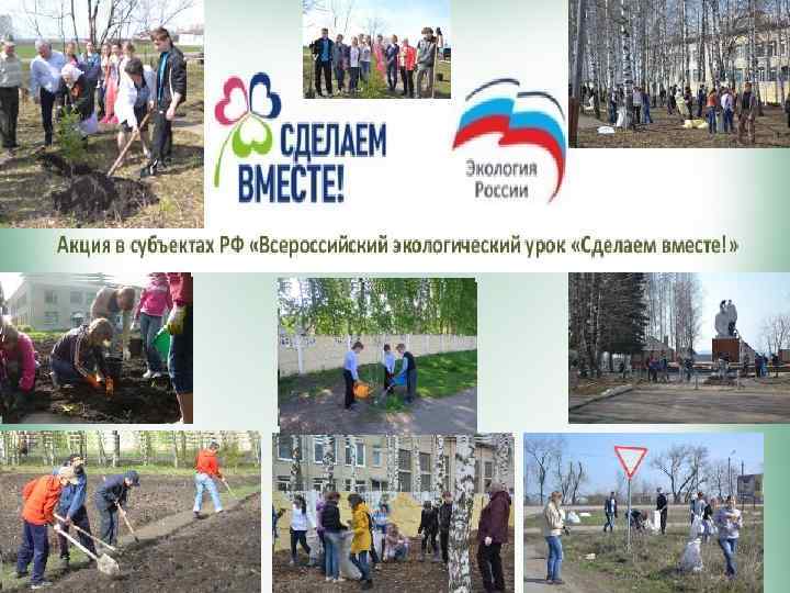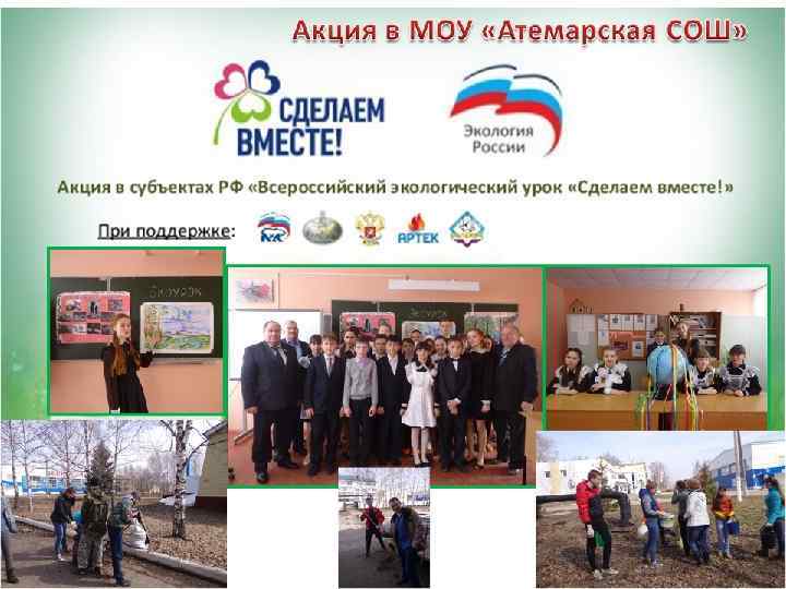 В рамках Всероссийской акции "Всероссийский экологический урок " Сделаем вместе!" в школе были зарегистрированы 39 эколидеров, которые провели 60 экоуроков для учащихся 3 -7 классов, экологический диктант. В рамках Зеленой Акции проводились субботники: уборка территории школы, территории памятника и села, работа на пришкольном участке. В рамках Всероссийской акции учащиеся нарисовали 30 плакатов на экологическую тему.