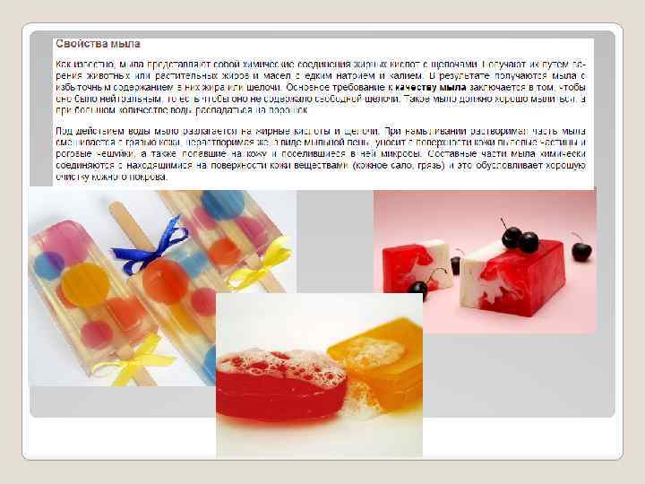 Интересные факты* Начиная с 1905 года, в Нижнем Новгороде под руководством купца первой гильдии Зелика Мордуховича Персиц было открыто производство оригинального мыла, за свой необычный внешний вид названного мраморным. По последним археологическим данным мыло использовали люди еще шесть тысяч лет назад. Оно состояло из животных жиров, золы и щелочных солей. Также существовала очищающая паста, состоящая из древесины хвойных деревьев, воды и эфирных масел. Во времена античности мыло изготавливали из древесной золы бука и животного жира. При помощи такого мыла люди не только очищали кожные покровы, но и окрашивали волосы. В средневековье мыло считалось очень редким и дорогим средством. Например, Изабелла Кастильская бывшая королевой Испании, использовала мыло всего два раза за всю свою жизнь: в тот день, когда появилась на свет и перед днем свадьбы. В Англии в 14 веке, мыловарам по закону запрещалось ночевать в одном доме с людьми обычных профессий. В 1399 году по инициативе английского короля Генриха Четвертого был учрежден специальный орден, членам которого отводилась привилегия мыться при помощи мыла. Производство мыла в России учредил Петр Первый, однако приблизительно до середины 19 века мыло было доступно лишь для знатных горожан. Крестьяне же пользовались щелоком, состоящим из воды и золы. На Руси существовали целые деревни занимавшиеся мыловарением, такая деятельность носила название «поташное ремесло» . Мыло в те времена производилось из животного сала и растительных масел.