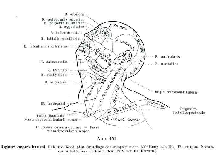 • Граница между головой и шеей проходит по следующим ориентирам: подбородочный выступ, тело и ветвь нижней челюсти, наружный слуховой проход, сосцевидный отросток, верхняя выйная линия, наружный затылочный выступ.