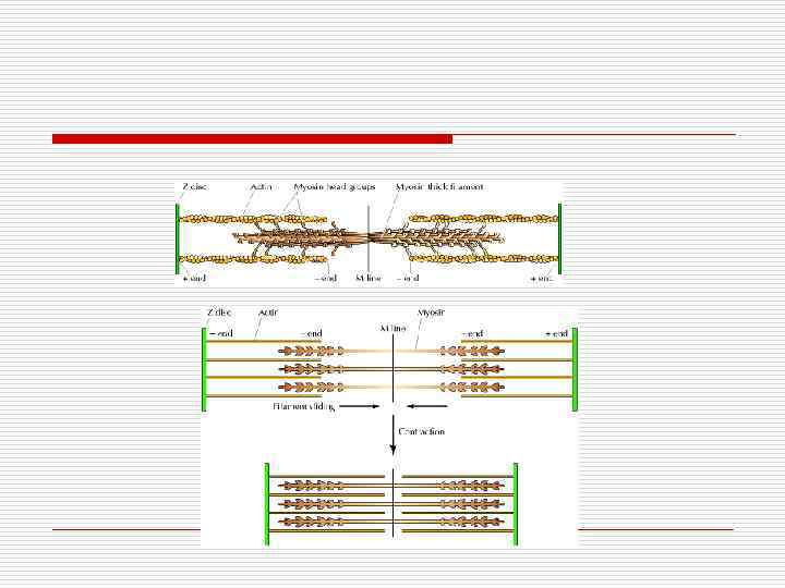 Сокращение o Последовательность событий при сокращении такова. - а) Возбуждение сарколеммы и далее - Т-трубочек б) Возбуждение мембраны терминальных цистерн o в) Высвобождение из цистерн ионов Са 2+ o г) Взаимодействие актиновых и миозиновых миофиламентов и перемещение их относительно друга o д) Укорочение миофибрилл и мышечных волокон.