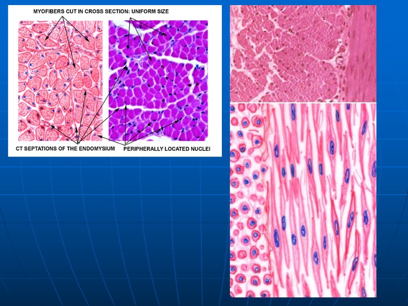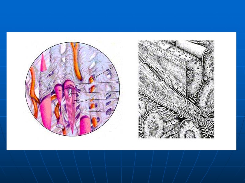 Развитие в эмбриогенезе РАЗВИВАЮТСЯ ПО ПРИНЦИПУ КОНВЕРГЕНТНОГО ГИСТОГЕНЕЗА Поперечно-полосатая скелетная мышечная ткань — из сегментированной части мезодермы. Поперечно-полосатая сердечная мышечная ткань — из мио-эпикардиальной пластинки (определенный участок несегментированной мезодермы). Гладкая мышечная ткань — из мезенхимы. Миоэпителиальная – из кожной эктодермы. Мионевральная – из нейроэктодермы.
