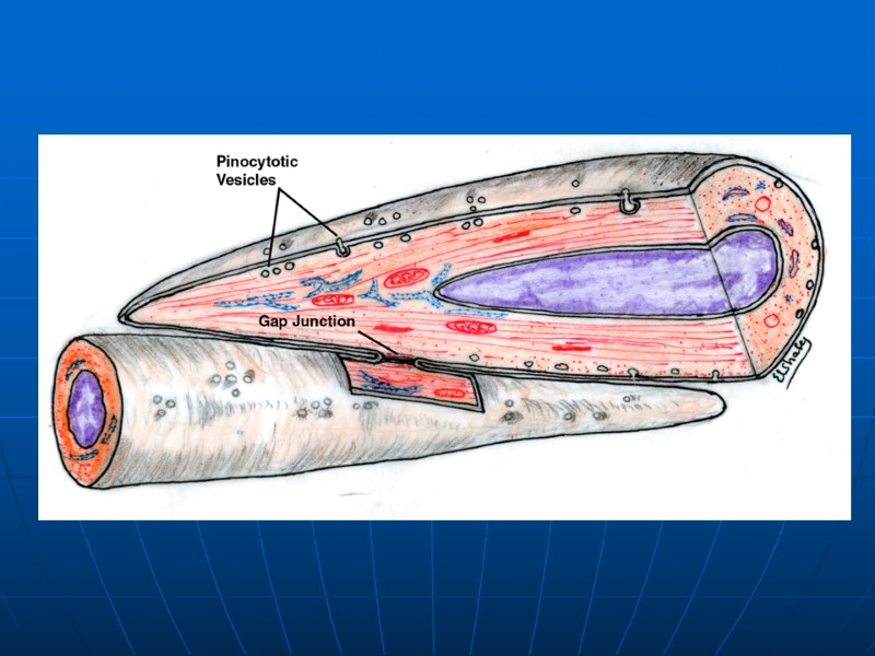 5) Иннервация. афферентная: свободные нервные окончания эфферентная: постгангионарные нервные волокна различной природы (холинергические, норадреналинергические, пептидергические, серотонинергические и др.) нейромышечные контакты: варикозные расширения аксона мотонейронов 6) Регуляция: - нервная - нервными волокнами от интрамуральных и экстрамуральных вегетативных центров - гуморальная - тканевые и системные гормоны и др.БАВ 7) Регенерация. - на клеточном уровне – митотическое деление - на субклеточном уровне (внутриклеточная регенерация)