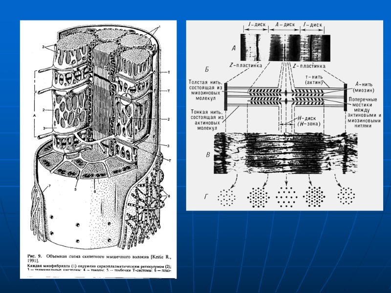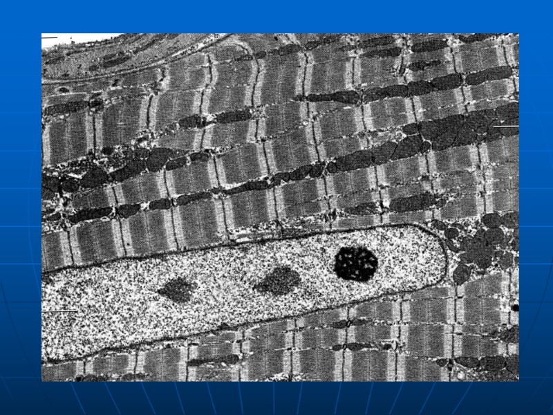 - миофибриллы характеризуются поперечной исчерченностью – регулярным чередованием светлых (I) и темных (A) дисков темные диски образованы миозиновыми фибриллами, светлые – актиновыми - наименьшей повторяющейся единицей миофибриллы, способной к сокращению, является саркомер, включающий в себя половину I-диска, А-диск и половину I-диска (формула его имеет следующий вид: 1/2 I + A + 1/2 I) - механизм сокращения: тонкие актиновые фибриллы втягиваются толстыми миозиновыми фибриллами вглубь А-диска (теория скольжения); процесс нуждается в АТФ и ионах Са