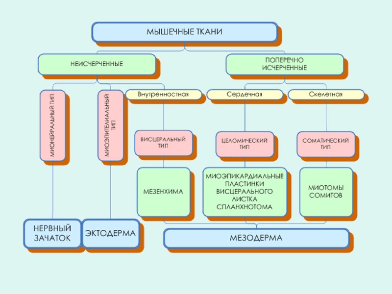 Основные три типа мышечных тканей: скелетная мышечная ткань сердечная мышечная ткань гладкая мышечная ткань. Они имеют разное происхождение, различные тканевые элементы, способность к регенерации.