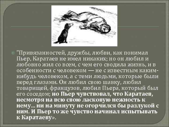 "Привязанностей, дружбы, любви, как понимал Пьер, Каратаев не имел никаких; но он любил и любовно жил со всем, с чем его сводила жизнь, и в особенности с человеком — не с известным какимнибудь человеком, а с теми людьми, которые были перед глазами. Он любил свою шавку, любил товарищей, французов, любил Пьера, который был его соседом; но Пьер чувствовал, что Каратаев, несмотря на всю свою ласковую нежность к нему. . . ни на минуту не огорчился бы разлукой с ним. И Пьер то же чувство начинал испытывать к Каратаеву» .