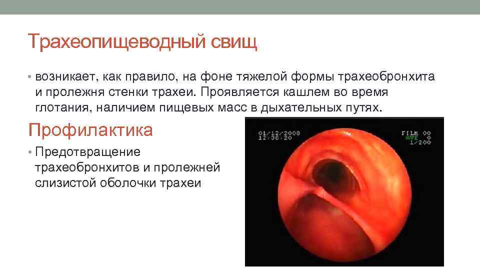 Трахеопищеводный свищ • возникает, как правило, на фоне тяжелой формы трахеобронхита и пролежня стенки трахеи. Проявляется кашлем во время глотания, наличием пищевых масс в дыхательных путях. Профилактика • Предотвращение трахеобронхитов и пролежней слизистой оболочки трахеи