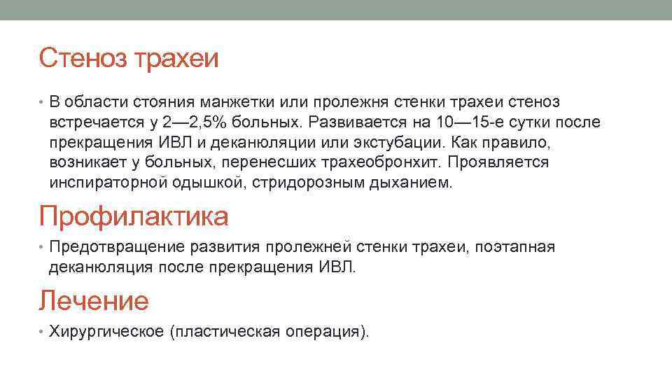 Стеноз трахеи • В области стояния манжетки или пролежня стенки трахеи стеноз встречается у 2— 2, 5% больных. Развивается на 10— 15 -е сутки после прекращения ИВЛ и деканюляции или экстубации. Как правило, возникает у больных, перенесших трахеобронхит. Проявляется инспираторной одышкой, стридорозным дыханием. Профилактика • Предотвращение развития пролежней стенки трахеи, поэтапная деканюляция после прекращения ИВЛ. Лечение • Хирургическое (пластическая операция).