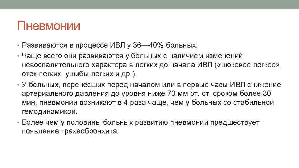 Пневмонии • Развиваются в процессе ИВЛ у 36— 40% больных. • Чаще всего они развиваются у больных с наличием изменений невоспалительного характера в легких до начала ИВЛ ( «шоковое легкое» , отек легких, ушибы легких и др. ). • У больных, перенесших перед началом или в первые часы ИВЛ снижение артериального давления до уровня ниже 70 мм рт. сроком более 30 мин, пневмонии возникают в 4 раза чаще, чем у больных со стабильной гемодинамикой. • Более чем у половины больных развитию пневмонии предшествует появление трахеобронхита.