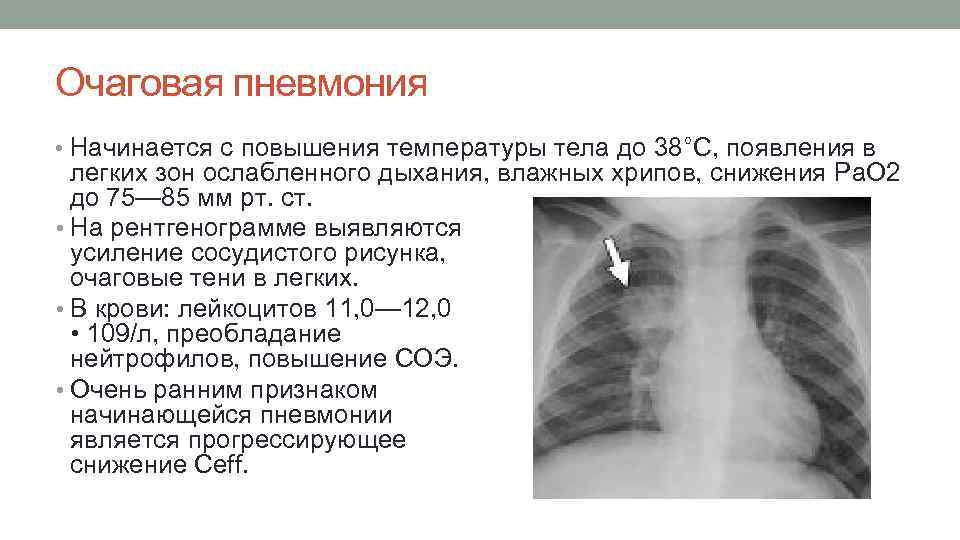 Очаговая пневмония • Начинается с повышения температуры тела до 38°С, появления в легких зон ослабленного дыхания, влажных хрипов, снижения Ра. О 2 до 75— 85 мм рт. ст. • На рентгенограмме выявляются усиление сосудистого рисунка, очаговые тени в легких. • В крови: лейкоцитов 11, 0— 12, 0 • 109/л, преобладание нейтрофилов, повышение СОЭ. • Очень ранним признаком начинающейся пневмонии является прогрессирующее снижение Ceff.