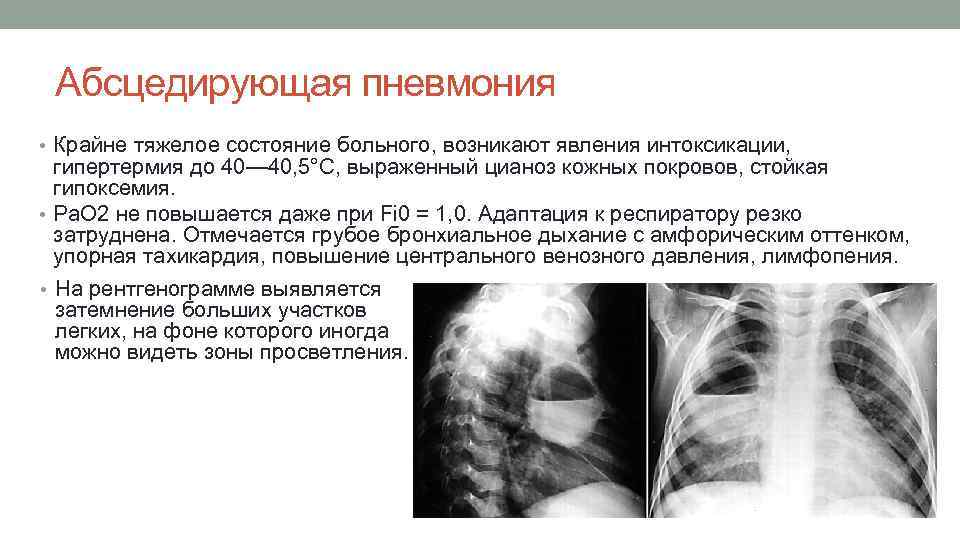 Абсцедирующая пневмония • Крайне тяжелое состояние больного, возникают явления интоксикации, гипертермия до 40— 40, 5°С, выраженный цианоз кожных покровов, стойкая гипоксемия. • Ра. O 2 не повышается даже при Fi 0 = 1, 0. Адаптация к респиратору резко затруднена. Отмечается грубое бронхиальное дыхание с амфорическим оттенком, упорная тахикардия, повышение центрального венозного давления, лимфопения. • На рентгенограмме выявляется затемнение больших участков легких, на фоне которого иногда можно видеть зоны просветления.