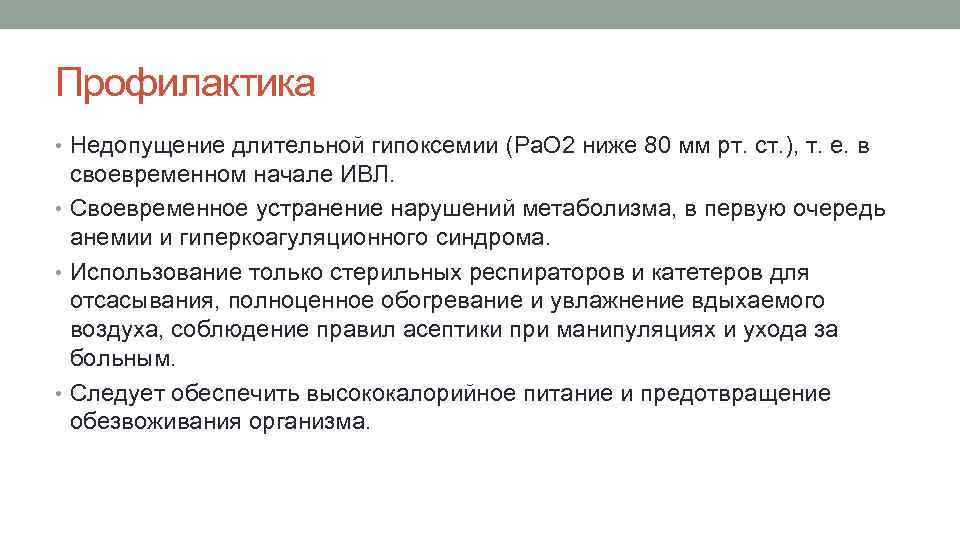 Профилактика • Недопущение длительной гипоксемии (Pa. О 2 ниже 80 мм рт. ст. ), т. е. в своевременном начале ИВЛ. • Своевременное устранение нарушений метаболизма, в первую очередь анемии и гиперкоагуляционного синдрома. • Использование только стерильных респираторов и катетеров для отсасывания, полноценное обогревание и увлажнение вдыхаемого воздуха, соблюдение правил асептики при манипуляциях и ухода за больным. • Следует обеспечить высококалорийное питание и предотвращение обезвоживания организма.