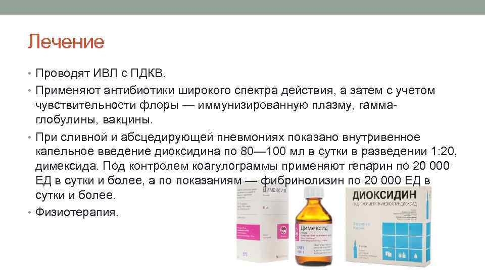 Лечение • Проводят ИВЛ с ПДКВ. • Применяют антибиотики широкого спектра действия, а затем с учетом чувствительности флоры — иммунизированную плазму, гаммаглобулины, вакцины. • При сливной и абсцедирующей пневмониях показано внутривенное капельное введение диоксидина по 80— 100 мл в сутки в разведении 1: 20, димексида. Под контролем коагулограммы применяют гепарин по 20 000 ЕД в сутки и более, а по показаниям — фибринолизин по 20 000 ЕД в сутки и более. • Физиотерапия.