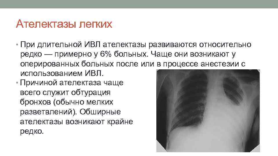 Ателектазы легких • При длительной ИВЛ ателектазы развиваются относительно редко — примерно у 6% больных. Чаще они возникают у оперированных больных после или в процессе анестезии с использованием ИВЛ. • Причиной ателектаза чаще всего служит обтурация бронхов (обычно мелких разветвлений). Обширные ателектазы возникают крайне редко.