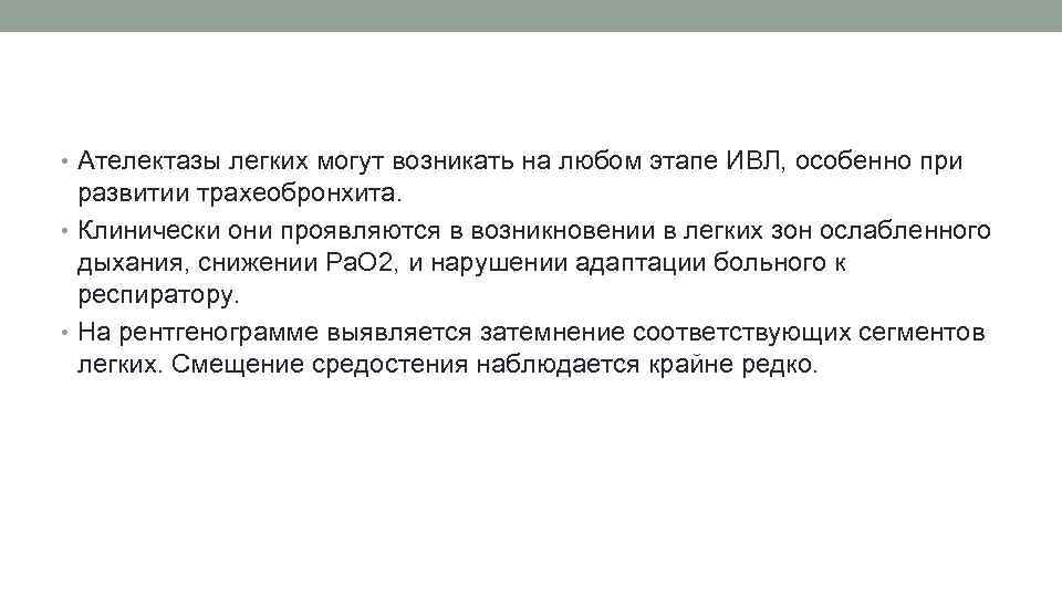 • Ателектазы легких могут возникать на любом этапе ИВЛ, особенно при развитии трахеобронхита. • Клинически они проявляются в возникновении в легких зон ослабленного дыхания, снижении Ра. О 2, и нарушении адаптации больного к респиратору. • На рентгенограмме выявляется затемнение соответствующих сегментов легких. Смещение средостения наблюдается крайне редко.