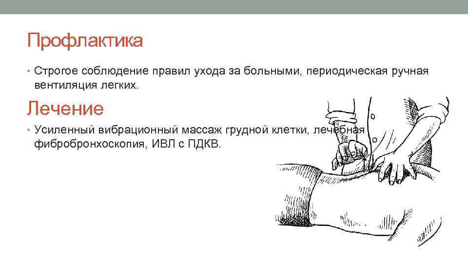 Профлактика • Строгое соблюдение правил ухода за больными, периодическая ручная вентиляция легких. Лечение • Усиленный вибрационный массаж грудной клетки, лечебная фибробронхоскопия, ИВЛ с ПДКВ.