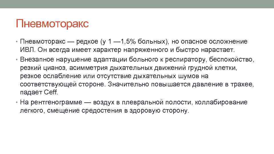 Пневмоторакс • Пневмоторакс — редкое (у 1 — 1, 5% больных), но опасное осложнение ИВЛ. Он всегда имеет характер напряженного и быстро нарастает. • Внезапное нарушение адаптации больного к респиратору, беспокойство, резкий цианоз, асимметрия дыхательных движений грудной клетки, резкое ослабление или отсутствие дыхательных шумов на соответствующей стороне. Значительно повышается давление в трахее, падает Ceff. • На рентгенограмме — воздух в плевральной полости, коллабирование легкого, смещение средостения в здоровую сторону.
