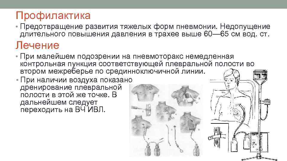 Профилактика • Предотвращение развития тяжелых форм пневмонии. Недопущение длительного повышения давления в трахее выше 60— 65 см вод. ст. Лечение • При малейшем подозрении на пневмоторакс немедленная контрольная пункция соответствующей плевральной полости во втором межреберье по срединноключичной линии. • При наличии воздуха показано дренирование плевральной полости в этой же точке. В дальнейшем следует переходить на ВЧ ИВЛ.