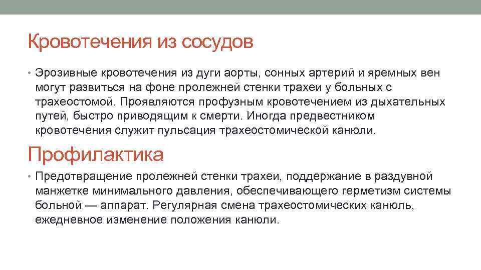 Кровотечения из сосудов • Эрозивные кровотечения из дуги аорты, сонных apтерий и яремных вен могут развиться на фоне пролежней стенки трахеи у больных с трахеостомой. Проявляются профузным кровотечением из дыхательных путей, быстро приводящим к смерти. Иногда предвестником кровотечения служит пульсация трахеостомической канюли. Профилактика • Предотвращение пролежней стенки трахеи, поддержание в раздувной манжетке минимального давления, обеспечивающего герметизм системы больной — аппарат. Регулярная смена трахеостомических канюль, ежедневное изменение положения канюли.