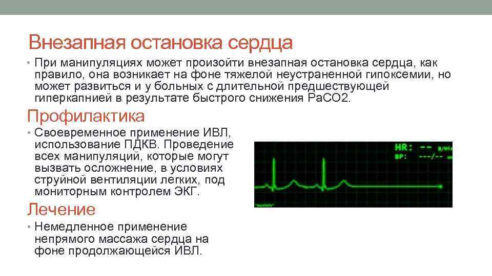 Внезапная остановка сердца • При манипуляциях может произойти внезапная остановка сердца, как правило, она возникает на фоне тяжелой неустраненной гипоксемии, но может развиться и у больных с длительной предшествующей гиперкапнией в результате быстрого снижения Ра. СО 2. Профилактика • Своевременное применение ИВЛ, использование ПДКВ. Проведение всех манипуляций, которые могут вызвать осложнение, в условиях струйной вентиляции легких, под мониторным контролем ЭКГ. Лечение • Немедленное применение непрямого массажа сердца на фоне продолжающейся ИВЛ.