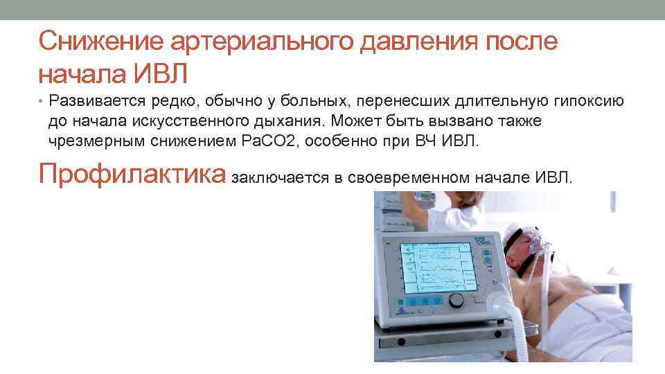 Снижение артериального давления после начала ИВЛ • Развивается редко, обычно у больных, перенесших длительную гипоксию до начала искусственного дыхания. Может быть вызвано также чрезмерным снижением Ра. СO 2, особенно при ВЧ ИВЛ. Профилактика заключается в своевременном начале ИВЛ.