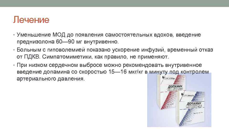 Лечение • Уменьшение МОД до появления самостоятельных вдохов, введение преднизолона 60— 90 мг внутривенно. • Больным с гиповолемией показано ускорение инфузий, временный отказ от ПДКВ. Симпатомиметики, как правило, не применяют. • При низком сердечном выбросе можно рекомендовать внутривенное введение допамина со скоростью 15— 16 мкг/кг в минуту под контролем артериального давления.