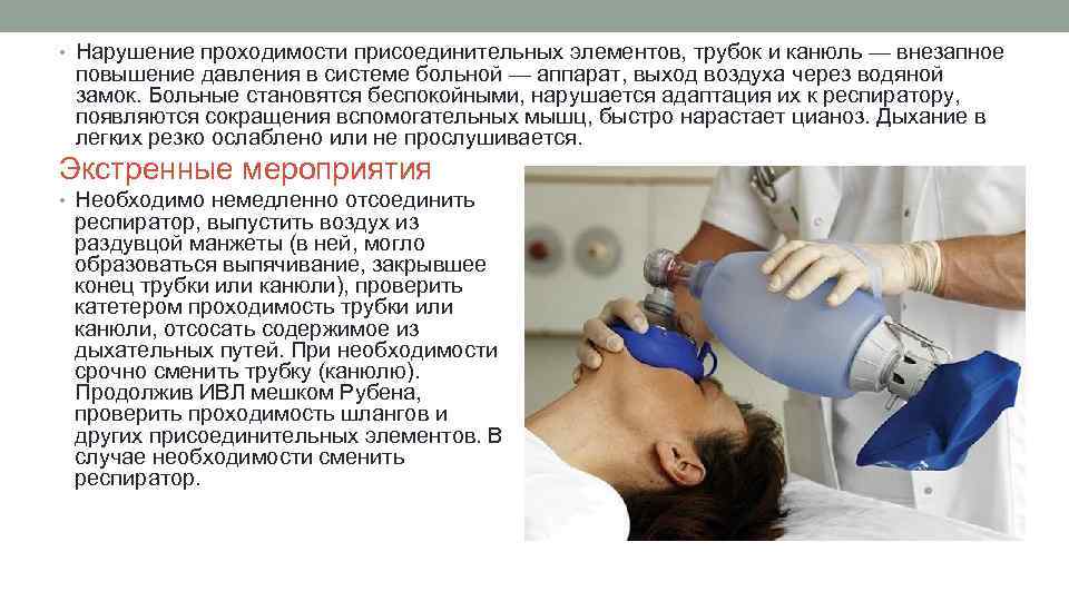 • Нарушение проходимости присоединительных элементов, трубок и канюль — внезапное повышение давления в системе больной — аппарат, выход воздуха через водяной замок. Больные становятся беспокойными, нарушается адаптация их к респиратору, появляются сокращения вспомогательных мышц, быстро нарастает цианоз. Дыхание в легких резко ослаблено или не прослушивается. Экстренные мероприятия • Необходимо немедленно отсоединить респиратор, выпустить воздух из раздувцой манжеты (в ней, могло образоваться выпячивание, закрывшее конец трубки или канюли), проверить катетером проходимость трубки или канюли, отсосать содержимое из дыхательных путей. При необходимости срочно сменить трубку (канюлю). Продолжив ИВЛ мешком Рубена, проверить проходимость шлангов и других присоединительных элементов. В случае необходимости сменить респиратор.